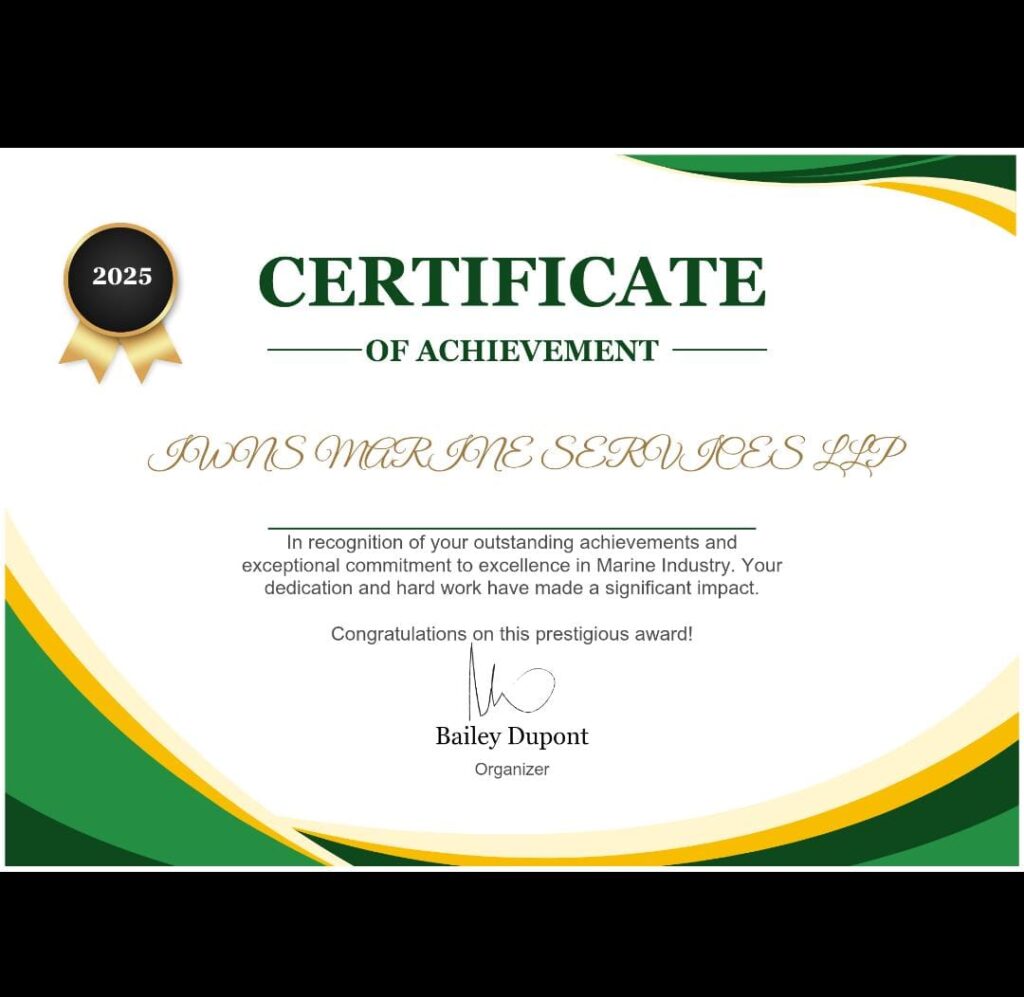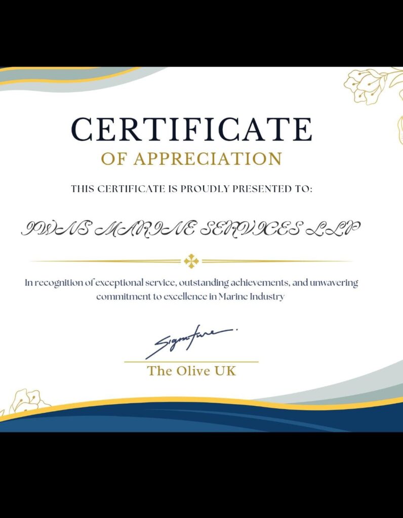 This Certificate of Appreciation is presented to IWNS Marine Services LLP in recognition of our dedication, reliability, and contribution towards delivering marine spare parts and services with excellence. It reflects our ongoing commitment to customer satisfaction and industry trust.
